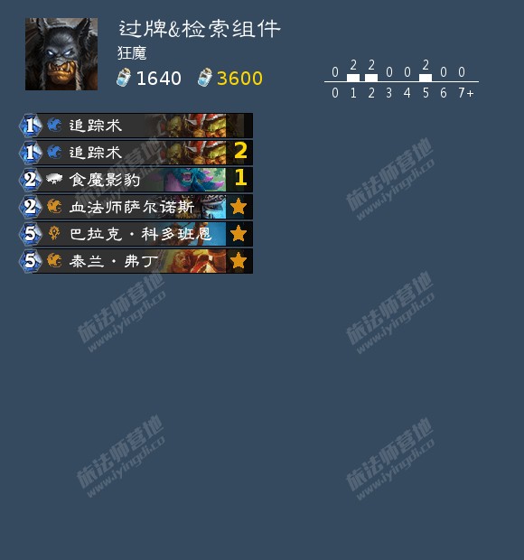 巴拉克·科多班恩是这套卡组甚至可以说是猎人的核心。食魔影豹在对战过程中发现效果并不是很理想,很多情况下在做完2阶任务后才有机会过到牌,故只带了一张,可舍弃。血法师萨尔诺斯与本套牌的契合度很高,能够配合解场法术使用,也可作为打脸的伤害补充,完成上述任务的同时还可以过牌。携带泰兰·弗丁的目的主要是为了检索巴拉克·科多班恩,同时也有一定的物理抗性。