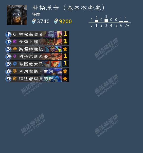 - 斯雷特教授 这张橙卡是替换单卡内笔者唯一觉得合理的一张。正面作用:在场面压力大的对局时作用明显,甚至可以作为一个翻盘点出现。其中对阵污手骑、任务手牌术时效果最显著。根据环境,考虑携带。