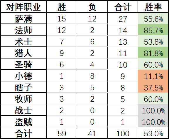 在进行了100局对战之后,我的排名从6w上升了4w名到了1w3(期间用任务萨做任务赢了几场,其余均为任务猎对局)。其中胜场59,也就是59%的一个胜率,对阵各职业胜负情况如下表。