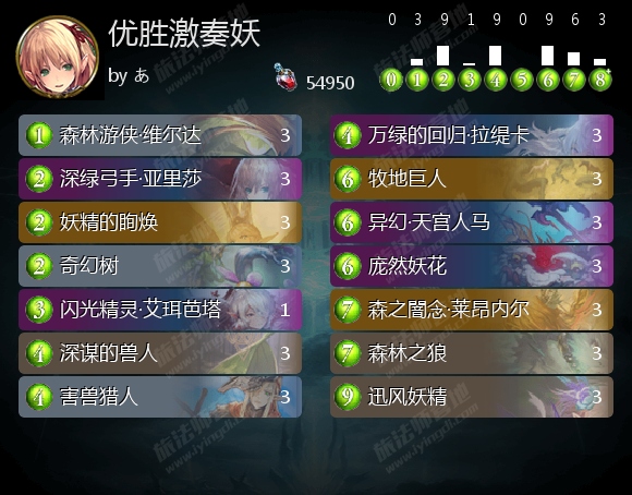 激奏妖在DLC前也有一定的使用量,尤其是在SVO的3Ban1赛制中更是大放异彩。拉缇卡+绚焕可以斩14,加一个闪光精灵、一个猫姐妹就可以打19,如果再瞬念召唤1个森林游侠的话就能满血斩——不过激奏妖其实并不需要满血斩,前期的牧地巨人和深谋兽人就可以在一边刷任务的同时一边打脸蹭血。
