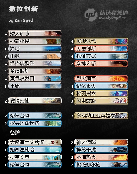 而史迹新篇为无畏创新带来了新的终端——撒拉密使。对战生物套牌进场喊生物基本就直接断了对面的念想(当然,还是要吃无敌的碎颅巨人),更重要的是撒拉密使不是传奇,可以同时拉两个出来,对战控制套牌clock速度也是飞快。虽然说打控制,不管你喊什么,神愤都能教你做人。但我们备牌局还有蓝长老呢!