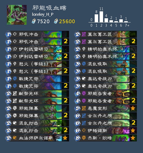 恶魔猎手有强大的过牌能力,且精明的奥术师、工匠配合献祭光环解场效率很高,很多时候都是用剑宗的方式打残对手,伊格诺斯配合混乱吸取和邪吼冲击这些牌都是补伤害的,我看到的构筑基本上都会带恶魔变形,这样打出杰斯之后还能用1费打4点伤害,从带这张和吸血瞎本身相性不好的5费卡手法术就能看出,现在邪能吸血瞎不存在一个绝对核心,伊格诺斯和吸血组件能减到费就用以前大家熟悉的方式OTK对手,不行的话就以杰斯为核心,用邪能法术灌伤害,这是一套思路比较灵活的卡组,我觉得也是伊格诺斯这张卡应该有的用法,而不是以前那样25张牌围绕着伊格诺斯构筑的畸形卡组。