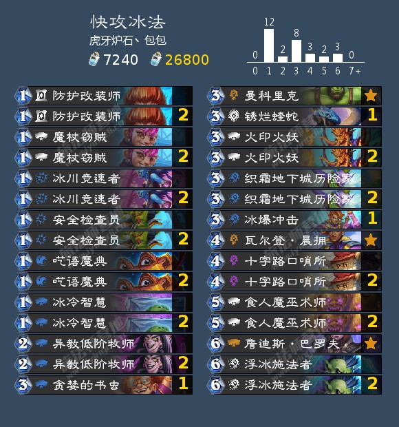 法师主播虎牙炉石丶包包#5436在标准传说8000名新构筑使用的一套法师卡组:快攻冰法,直播中战绩20-11。这套卡组优势对局刀贼、法术法、奇迹贼;均势对局任务术,T7猎,法术法德,4费前不来十字路口哨所就劣势;劣势对局快攻骑,暗牧等同样铺场职业,这类对局中,铺场交换随从能力不足,十字路口哨所和食人魔基本白亏。