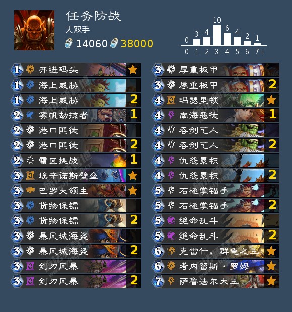 来自营地老哥大双手的一套任务防战,他使用这套卡组以60+场65%胜率打到传说2w名左右。