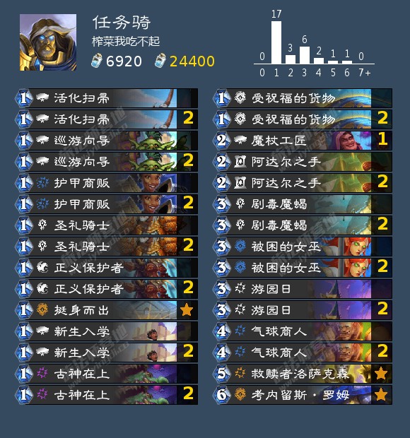 来自营地老哥榨菜我吃不起投稿的一套任务骑,他用这套卡组在传说段位打出了71场约75%胜率的战绩。这套卡组的思路比较明确,起手留除了活化扫帚和古神在上之外的1费牌来做任务,后手面对术士可以留古神在上。被困的女巫和剧毒魔蝎优先找1费牌做任务,在血线压力较大的时候找奶苟活。一般牌比较顺的时候5费可以做完任务,其他情况下6、7费也能保证做完任务。任务奖励配合气球商人或者救赎者洛萨克森可以堆叠出场面优势,基本上大部分天梯卡组都抢不过场面。总的来说这套卡组上手比较容易,同时也给了被削弱后的圣骑士一个新的思路。另外值得一提的是,魔杖工匠有时候给的1费卡不尽如人意,可能用处不大或者和手牌重复卡任务进度,可以换成任意一张针对卡。
