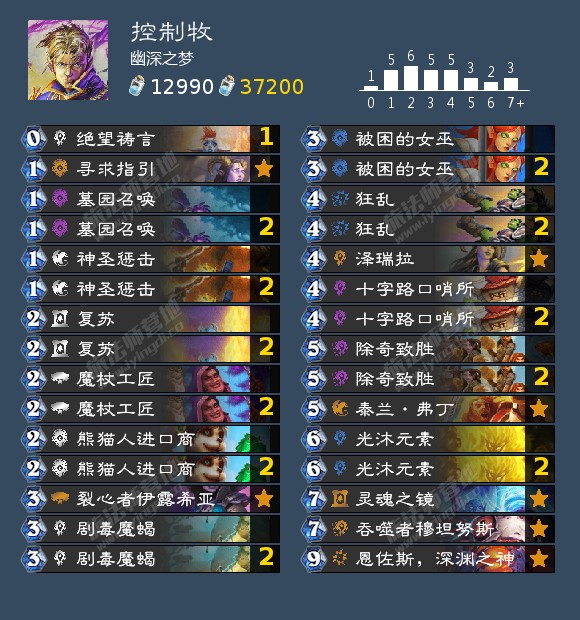 与常规任务牧相比,这套卡组更多的带上了墓园召唤、被困的女巫等额外的资源牌来加快任务进度,以更好的过渡前中期。幽深之梦觉得墓园召唤是一张上限很高,很灵活的牌,方便做任务的同时还可以在中后期找光沐元素,莫尔葛熔魔等回一大口血;由于亡语没有9费,因此通常最贪可以在9费时开。幽深之梦认为由于卡组资源足够且经常血量吃紧等原因,亡者复生日常卡手,因此选择舍弃,而同时只带除奇制胜舍弃掉了罪罚则仁者见仁,如果分段里快攻猎超生德等快攻偏多,可以考虑舍弃掉笨重的恩佐斯+泰兰弗丁体系重新带上罪罚。而十字路口哨所可以一定程度上提高对任务术,任务法等卡组胜率。卡组整体思路偏向于依靠场面组织攻势,对比常规任务牧在场面上更优,某些对局也能有机会依靠前中期杂毛蹭血取胜而非一昧防守。