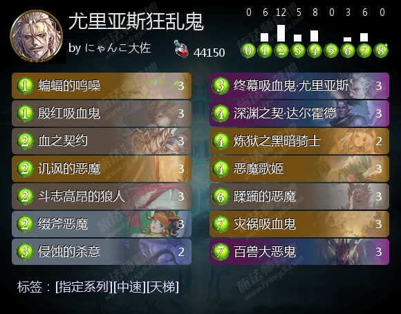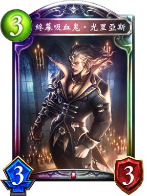 终幕吸血鬼·尤里亚斯能通过进化制造惊骇之夜,进而制造能补充资源的梦魇时分,可以解场、蹭血的血腥利爪,以及能解场并抵消自残伤害的悚惧气息,发挥各种各样的效果,赚取资源、节奏和血量优势。