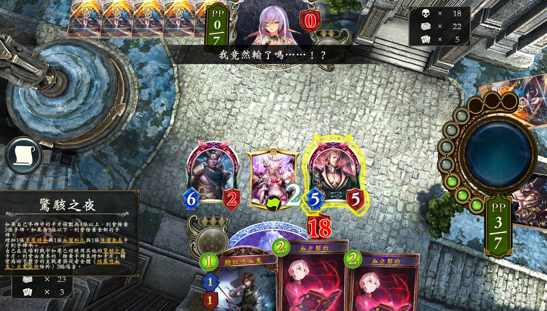 前期优先使用讥讽的恶魔、缀斧恶魔。视情况激奏蹂躏的恶魔、灾祸吸血鬼,使用血之契约、侵蚀的杀意。不要为此亏损太多节奏即可。