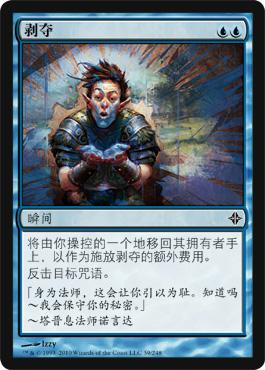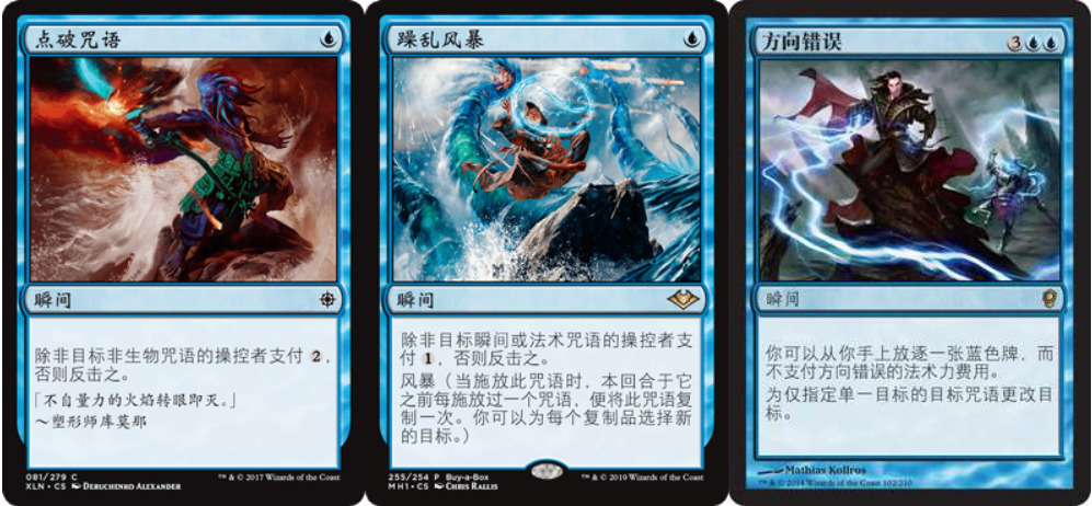 尽管如此,我还没有为目眩找到一个好的替代品。点破咒语/躁乱风暴我以前用过的,对付控制套牌和组合套牌可能很好,但对付掘密师和节奏套牌要差得多。如果他们用意志之力康你的启动点,而你必须使用额外的法力来源来反击点破咒语/躁乱风暴,通常只会使得他们能够使用原本已经无用目眩。方向错误是另一个选择,但只对反击有用,不能用来反制对手的关键咒语。