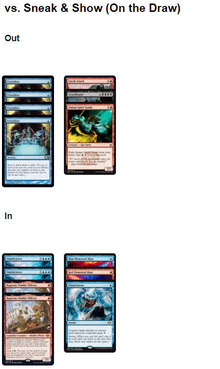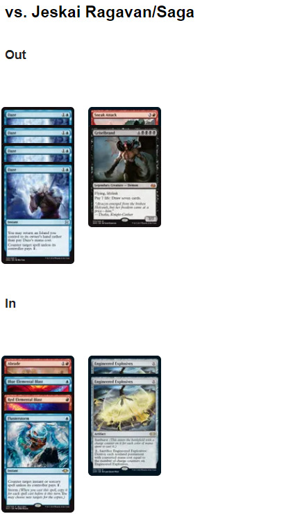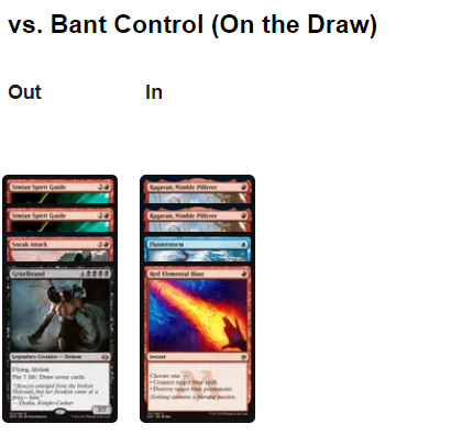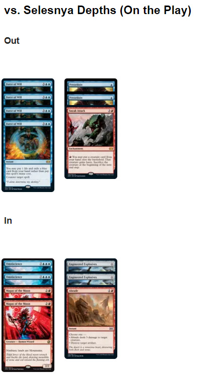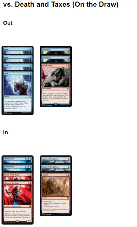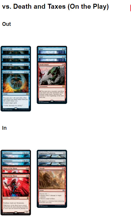 即使对局过程不同,你在这个对局中使用的备牌与你在对抗DNT时还是相同。与DNT相比,你必须与法术力破坏和仇恨单卡进行战斗,而与白绿深渊的战斗则更多地围绕着竞速或破坏他们的组合同时为卡拉卡斯做好防备。