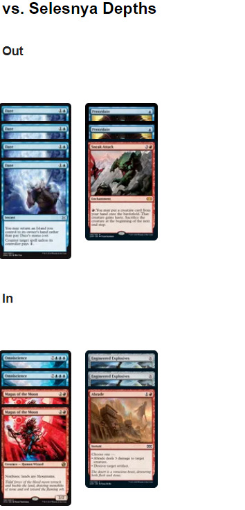 相对直接地,只要他们的五张牌不包括灵魂洞窟,你的谆谆教诲与棘泽边的最佳和最快组合技通常胜过他们的末日组合技。棘泽边可以抽足够的反击咒语来赢得与对手的互康大战,或者如果你的法术力允许,抽到偷袭+万世创伤伊莫库也可以赢。