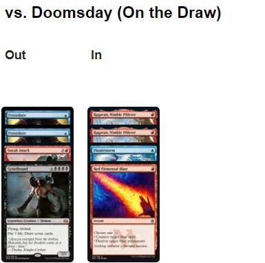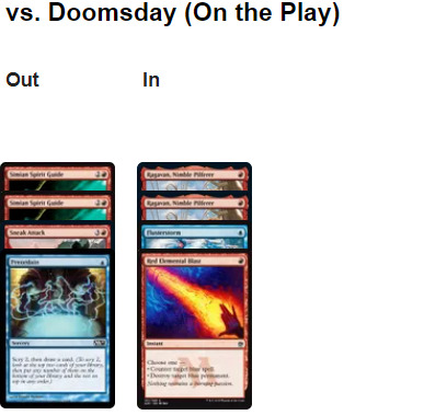 末日组合技与偷袭教诲并列的第二套顶级组合技套牌,这是相当接近的对局。受到弃牌和反击咒语保护的快速1卡combo的威胁,这个对局通常就是先后手游戏。这一点被两个套牌中的4个目眩放大了。
