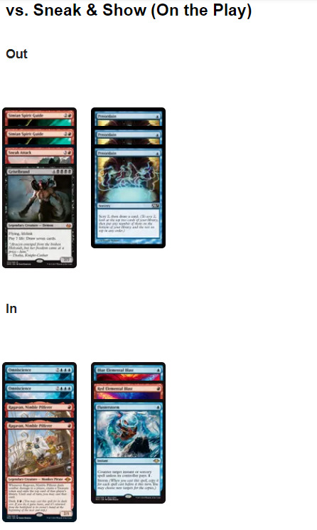如果你注意到某些对手有这样的打法,或者总体上想对冲这种打法,你可以考虑在先手和后手中用2张全知全能替换2张注定。这还有一个额外的好处,即有可能将谆谆教诲拍万世创伤伊莫库变成谆谆教诲拍全知全能再拍万世创伤伊莫库从而当场获胜。