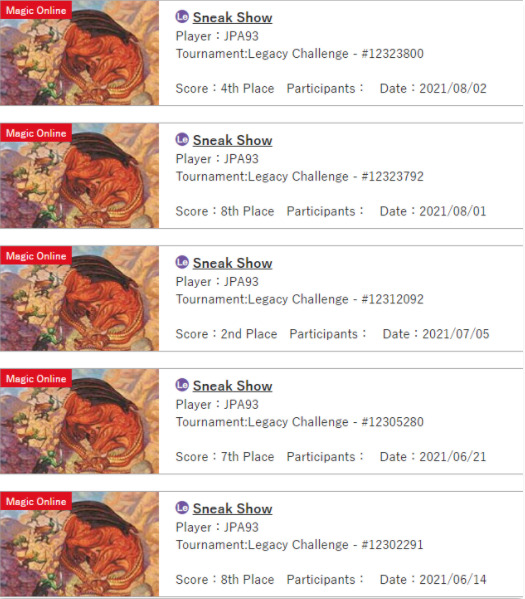 我看到了让偷袭教诲套牌回归的机会,它在对抗奇迹或地套等经典的反掘密师套牌时总是有不错的胜算。 在接下来的几周里,我在五个MO Legacy Challenge 中进入了前8名,以70% 的胜率完成了近100场顶级赛事。