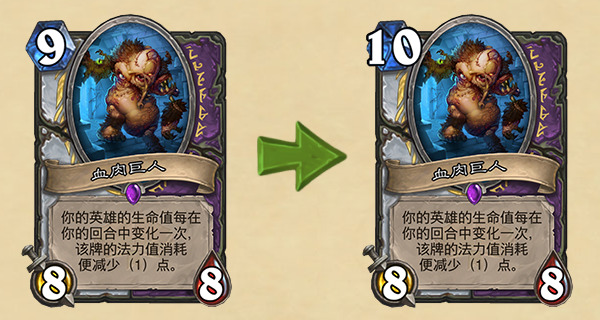 开发者评论:我们会将血肉巨人的法力值消耗提高1点,以进一步延后它在对战中的平均出场时间。我们查看了最初的平衡性改动的效果,并且认为改动过于轻微,因此对血肉巨人进行了相应的调整。