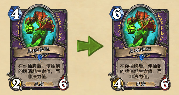 开发者评论:虽然带了灵魂窃贼的套牌胜率并不是特别高,但通常会以非常极端的方式赢得对战。这一改动与我们在“暴风城下的集结”第一次平衡性补丁中的理念类似,旨在减慢灵魂窃贼的对战节奏,缓和可能出现的极端情况。注:经过本次改动之后,灵魂窃贼依然无法在狂野模式中使用。