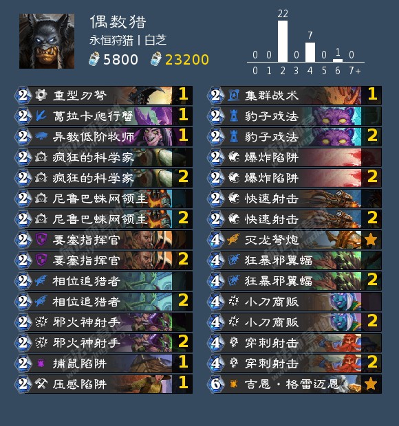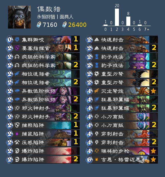 还有一点很重要,偶数猎的伤害计算问题,如何把伤害最大化。举个例子,后手打法师有豹子有邪火,因为豹子大概率触发,但是邪火在3回合打出的伤害会比豹子多2。还有一点是科学家与豹子的选择,科学家的问题在于它是亡语怪,很多卡组会选择视而不见,蛋豹子又不是稳定触发,这里就需要根据手牌与对手职业进行选择,如果是暗牧这样的职业,前三回合多半不会用法术,那么感紧下科学家送了压缩牌库找爆炸,如果对面是术士与德鲁伊法师这样的职业,三费会有赛车回火这样的法术节奏,那么推荐豹子。因为科学家和豹子给予的伤害量是一样的,所以要根据情况。最后一点,打术士要学会博弈小赛布,什么时候压,压3不压4,压4多半吃亵渎,123全解,压三小赛布能卡对面一手,不管是亵渎还是火焰的灾祸都可以卡一手,这样伤害能走到对面脸上。