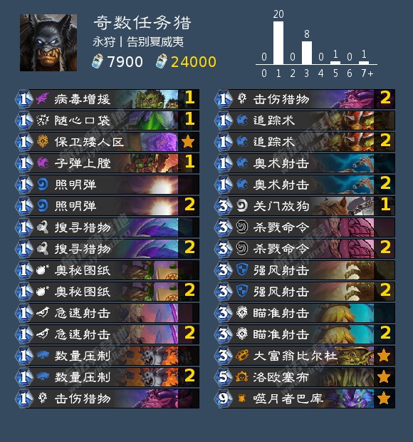 奇数任务面对暗牧,海盗战这种无脑做第一阶段任务,很重要很重要,因为对三血核心怪的处理,才是奇数任务优势于其他几个任务体系猎人的关键所在。但是面对术士要学会攒手牌,起手有支线任务给我挂支线任务,一定要把射箭的节奏拉满,不要一股脑子做任务,不然很容易出现4费做完第二阶段任务手牌见底,费用浪费的情况。