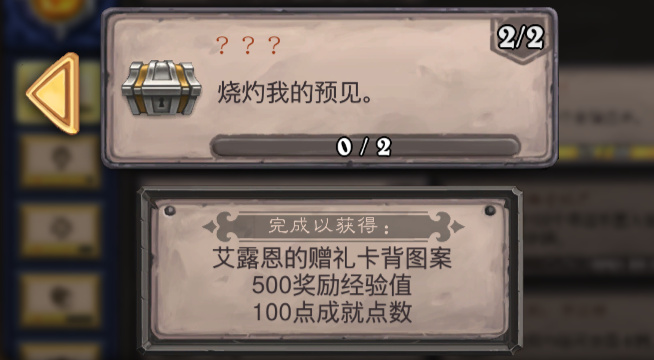 实际上这个谜面还要和这个成就的奖励卡背“艾露恩的赠礼”联系起来,“我的预见”即“艾露恩的预见”,即艾露恩神谕者;“烧”则是月火术(Moonfire)。