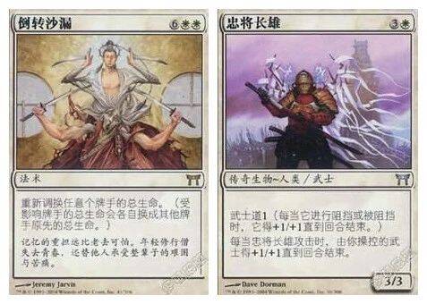 我的第一包就给了我以上这个选择。你(以及那桌的其他人)可能很难理解我的抉择点在哪。忠将长雄非常厉害,而倒转沙漏则是辣鸡,那我纠结什么呢?这就是我的轮抓风格——我非常喜欢倒转沙漏。这个系列的限制环境速度很慢,你可以轻松利用法术力灼烧规则以及倒转沙漏来打出漂亮的逆转。是的,那时候法术力灼烧还没有被移除(译注:当年的规则,没用完的法术力会对操控者造成伤害)。