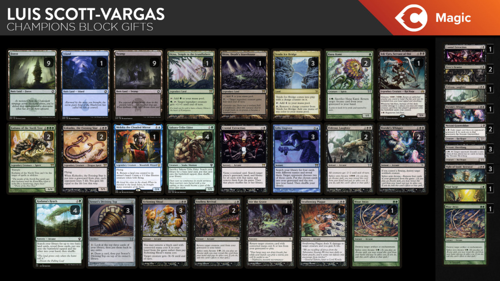 我和Web为这场大赛进行了无数的测试。测试团队只有我们两人,我们也不知道我们到底在干啥,但我对我们的工作成果还是很自豪的。虽然我们的牌表不是最完美的版本,但最终我们还是找到了环境中最好的套牌(在当年这种信息不发达的时代,这项成果真的很了不起)。赛制为神河环境构筑赛,当时未送出的礼物正在统治环境。