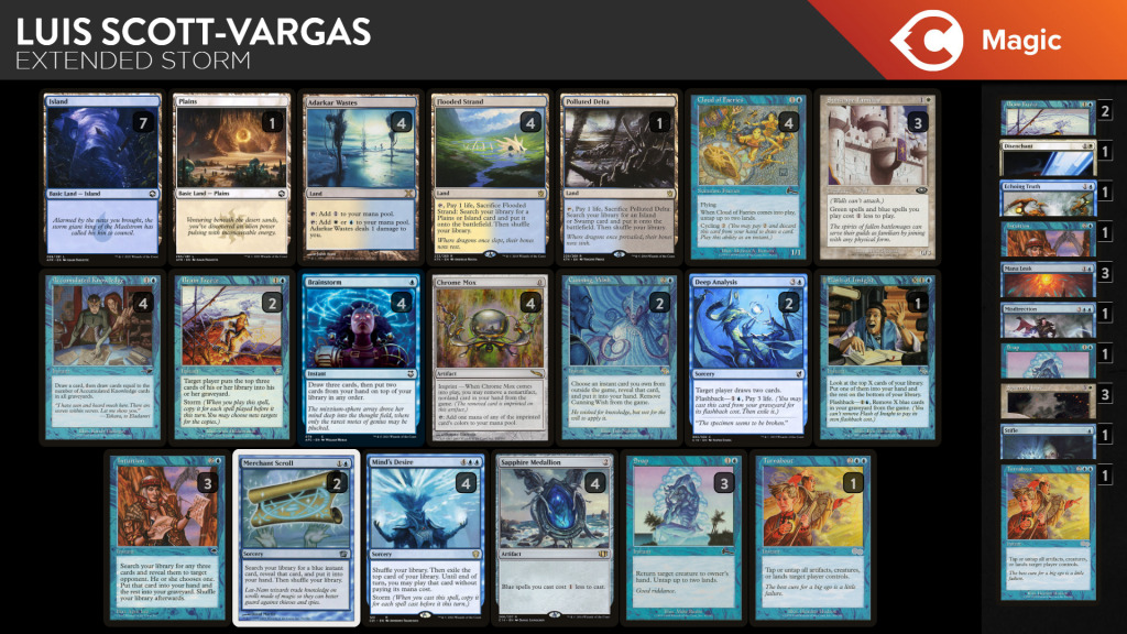 这是一个风暴套牌,套牌计划是是使用蓝宝石徽章和阳景院佣兽这类的费用减免效应,配合弹指和仙灵云群这样的重置效应,产生海量的费用并施放海量的咒语,最后施放心之所欲或是黠智祈愿。这是我第一个完全精通的套牌。我经常坐火车从学校去奥克兰,坐在牌店里一遍遍地练习这个套牌,练习判断啥时候可以启动说书,啥时候时机还不成熟。