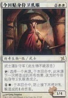 如果你仔细阅读了牌面,你就不会犯我第一轮的对手犯的错误。他用两个2/2踢我,然后就尝到了武士道的厉害(译注:武士道是每当此生物进行阻挡或者被阻挡时,它获得+X/+X);然后他想用3/3换我的3/3,又被乳眼的横置异能摆了一道;接着他又想用4/4换我的4/4,又被防止伤害的异能惩罚了。总的来说,乳眼免费干掉了对面的三个生物,送了我一个Easy win。