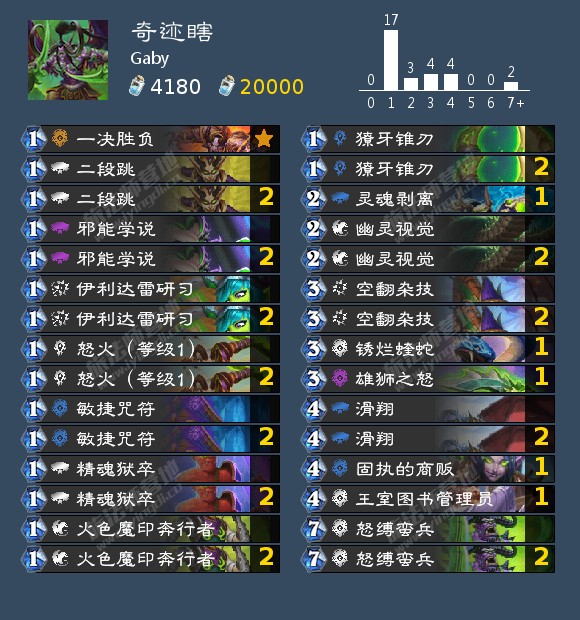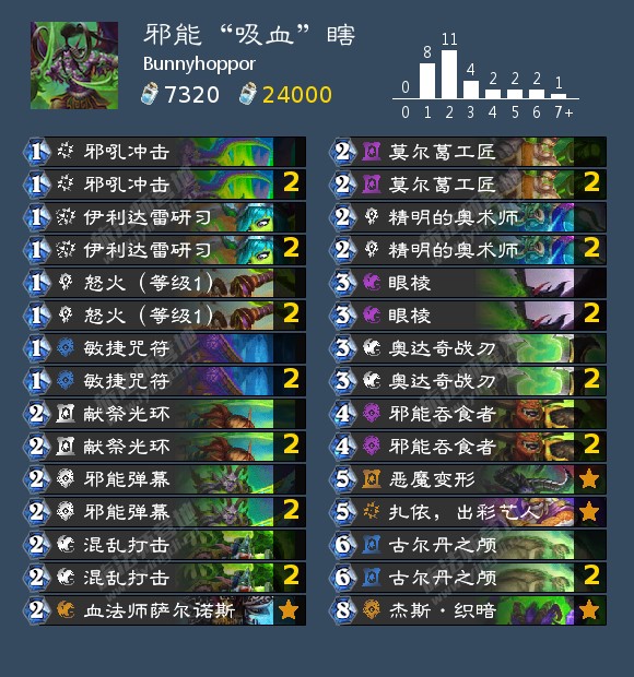 先来讲讲本次比较亮眼也比较让人摸不着头脑的一个改动,起初我以为去掉伊格诺斯带扎依,出彩艺人只是个别人的黑科技,结果没想到扎依才是主流之选(下以bunny的卡组为例子),经过询问之后发现是有人用这个改动打上了亚服第二。然后就被席卷八荒地采用了。细想之下扎依,出彩艺人的定位确实和伊格诺斯相近,都是担当卡组里补输出的单卡,只是方式不同。扎依,出彩艺人可以通过复制邪能法术投资杰斯·织暗(相当于1张变4张),或者直接复制其本体。由于邪能吞食者,敏捷咒符和古尔丹之颅的存在,费用效率倒是没有那么糟糕,但是伊格诺斯提供的是奥达奇战刃与邪吼冲击搭配法强翻倍的爆发输出,科代表的观点是大部分对局都需要伊格诺斯来斩杀,缺少了这个点会缺相当多的输出。且精明的奥术师和莫尔葛工匠仅参与解场轮次的话表现还是有些不够好的。当然你也可以像eddie一样“我全都要”。不过照搬天梯上的思路在这个快攻式微可能更需要输出的环境里,我很难觉得扎依,出彩艺人是一个那么激动人心和有效的改进。