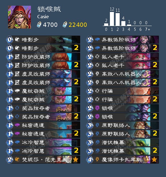 Casie在锁喉贼中加入了一张梵妮莎·范克里夫。不出意外的话我猜测大概率是为内战准备的,以暗影步收尾的情况(回联络人八爪这种)的情况并不少见,此时梵妮莎·范克里夫便能配合原野联络人一波刷爆,其他对局里没有联络人的情况下拿到质量与直伤也是好的,本身两费连击对于体系的负担并不大,以极小的代价换取了更高的维度。