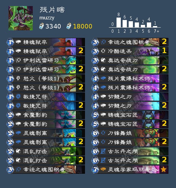 muzzy再一次让我们大开眼界,这次他拿出了一套相当复古的残片瞎,复古到以至于整套牌只有怒火与敏捷咒符是狮鹫年的单卡,颇有种恍如隔世的意味在,展开方式就是去年的残片瞎,只不过缺少了刃舞,在面对有巨型生物的卡组应该会有些吃力。
