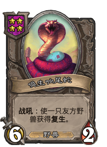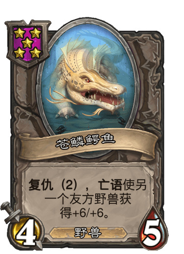 这个流派有前期小跳蛙起手,配合瘟疫鼠群,长鬃草原狮,新卡鸟类的同伴,幼苗催长员,直接碰5熊妈妈苍鳞鳄鱼,用唤生响尾蛇打复生buff,前期战力十分爆炸,抬人非常凶,就是很难转成鹦鹉狼爹流拼后期,其中新卡苍鳞鳄鱼的复仇2,使一个野兽加6攻6血可以重复触发,野兽的高频率和这张卡配合十分可怕,有了这张卡极有可能通过频率吃到烂分,最契合这个流派的英雄当然是死亡之翼啦,希望死亡之翼快点回来吧。