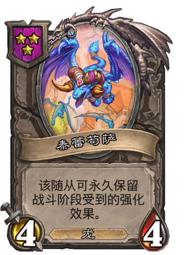 虽然雏龙走私商(杨超越)的bug修复了,但是雏龙走私商加血还是很客观的,然后3本传说龙泰蕾苟萨可以继承战斗中的buff,哪怕是战斗中获得buff,杨超越也能给泰蕾苟萨加血,泰蕾苟萨如果吃到了奥拉基尔的技能是可以继承圣盾嘲讽风怒的,吃到伊利丹的技能只能加2攻并不能先攻(即便buff一栏写了先攻),泰蕾苟萨配合珍惜增强幼龙,永久buff叠得很快,不是很需要立马碰出卡雷苟斯来增加战力,来了卡雷苟斯会很强,更多时候红衣纳迪娜对走地龙来说比卡雷更强势。走地龙选奥拉基尔给泰蕾苟萨加圣盾嘲讽比较强势,钩牙,欧穆,红龙女王,伊瑟拉等英雄是比较适合走地龙的,顺便说一下4本的破盾龙普瑞斯托的火炎子嗣战力堪忧 ,虽然能破盾但是自身的身材实在太差了,龙又不太可能去单养这个龙,除非打鸡杂,尽量不要拿,龙攻击的时候打3这个效果真不太行。