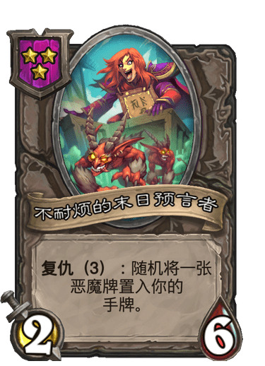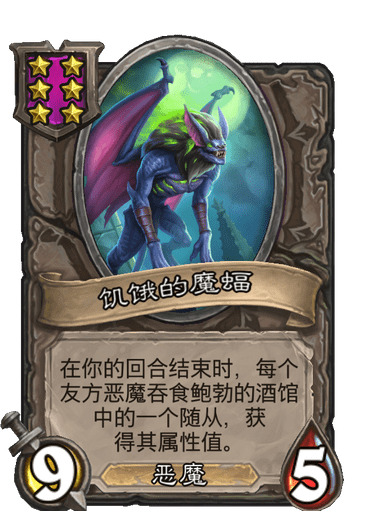 不耐烦的末日预言者的效果是复仇3,将一个恶魔加入手牌,这个复仇效果极为强大,不仅给的是单一套路的恶魔随从牌,还能补充经济能力来更快的上本,也能用复仇出来的恶魔站场稳定战力。不耐烦的末日预言者是此套路的核心,无论是在5块钱第三回合直接跳3本拿到不耐烦的末日预言者直接当核,还是慢慢等7块钱第五回合升3本慢慢搜不耐烦的末日预言者都可以,对于打工随从最好是小鬼囚徒,克苏恩的侍僧等频率比较高的打工怪,不耐烦的末日预言者站最右边,避免被击杀掉无法发挥复仇3,将一个恶魔加入手牌的效果(受制于当前酒馆等级),这个效果配合恶魔流5本核心贪食的乌祖尔恐魔的效果,每使用一张恶魔牌就吃掉酒馆里一个随从的属性,在没有鱼的局简直无敌,现在没有毒鳍鱼人毒也不好做,又有经济又有战力,在碰出了6本核心饥饿的魔蝠后所有场上的恶魔随从都能吃酒馆里的随从,不需要额外花费铸币提升,可以从容上6本需求更多发展,饥饿的魔蝠是最直接效果最强的恶魔流核心,可以前期拼一枪直接碰6,碰到饥饿的魔蝠随便拿几个恶魔烂分有了,弱点就是遇到玩鱼人而且成型了对手相当劣势,现在鱼人成型更快了,套路也更完整了,但是恶魔流这个发育超快最容易成型的流派毫无疑问是当前的T0流派。