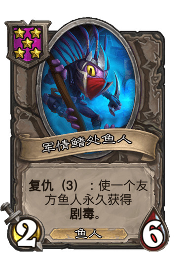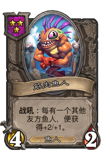 这个版本的鱼人得到了很大幅度上的加强,虽然失去简单高效的毒鳍鱼人,但是获得了永续复仇效果上毒的军情鳍处鱼人,和前期就是大哥的筋肉鱼人,鱼人版本更新前最大的问题就是没有大哥鱼,前期身材靠群体buff养普普通通然后就打不过,现在有了大哥鱼筋肉鱼人前期更强势了,前期轻轻松松养出一个大哥鱼打工,后期配合海鲜投喂手和铜须,身材就是无限大,上限高下限也高的鱼人牌。鱼人比较适合的英雄有铜须,不需要找铜须自己可以带铜须,菌菇术士,菌菇术士的技能就是为了鱼人而生的,在加强以后玩鱼人更顺畅了,女巴罗夫因为技能可以无限刷buff,也很适合鱼人,在这里我还要推荐一个鱼人流英雄,阮大师,阮大师的技能池里有菌菇术士,女巴,乔治(贴盾),奥秘哥,等特别适合鱼人的技能,人品好的时候玩鱼人就会特别强。这里要特别说明一下海鲜投喂手,海鲜投喂手是可以点金酒馆里的鱼人的,这时战吼的鱼人效果比如鱼人斥候(发现鱼),筋肉鱼人,寒光先知(加血鱼),都有双倍效果,配合铜须更是四倍效果,鱼人终于有理由去碰6了,当然大德鲁伊哈缪尔也不错。军情鳍处鱼人相当强大,这张牌在复仇3次以后是可以给自己加毒的,在玩其他套路的时候也可以试着用这张牌做个毒出来,如果金了可以做两个毒,我是很愿意给军情鳍处鱼人用海鲜投喂手点金的,至于如何触发复仇效果,虚空领主(939),阿古斯防御者,克苏恩的侍僧都很不错。当然鱼人的核心永远是铜须·布莱恩,有了铜须鱼人就养得很快,至于铜须来不来全凭缘分,非常不建议在4本对铜须不对到不升5,回合数拖得越多,未成型鱼人更容易突然出局,5本的拜戈尔格国王(国王)更有效率,而且做剧毒的军情鳍处鱼人也在5本,一直呆在4本会积重难返。
