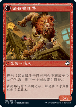 如果你需要知道一张转化式双面牌背面的法术力值,则利用其正面的法术力费用。举例来说,酒馆破坏兽的法术力值是4。我们明白这有一点奇怪,但是当对手试图对它施放涤除(出自2021核心系列)却无法为之时,你就会感谢这条规则了。