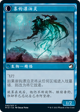 只要饵钩钓客在你的坟墓场中(无论它是因何落于该处),你都能利用其惊扰异能来施放其背面。有别于我们迄今所见的其他转化式双面牌,你这样实际上是在施放牌的背面,因此会将祟钩漂泊灵放在堆叠上。你不是支付其法术力费用(你也看到了,它根本没有),而是支付{1}{U}的惊扰费用。