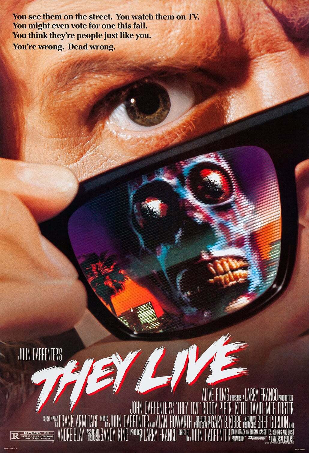 《极度空间》于1988年上映,是一部典型到不能再典型的B级片:男主孤身一人来到大城市生存,机缘巧合获得了一副墨镜,能透过所有商业广告看到背后的资本逻辑,“不要思考,要消费”,而这一切阴谋都来自已经混入人类族群中的外星人。最后男主摧毁了电视台的天线,让外星人暴露身份,解除了电视对居民的洗脑。