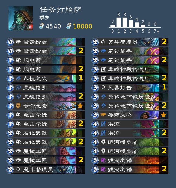 笼斗管理员/毁灭之锤:无论快打还是慢打,风怒锤所提供的伤害都是我们重要的制胜手段,因此我们这套牌选择满编笼斗管理员和毁灭之锤。笼斗管理员本身虽然不是过载牌,但就像普通任务萨会携带投资良机一样,抽到过载牌本身对于完成萨满任务也是很优质的。