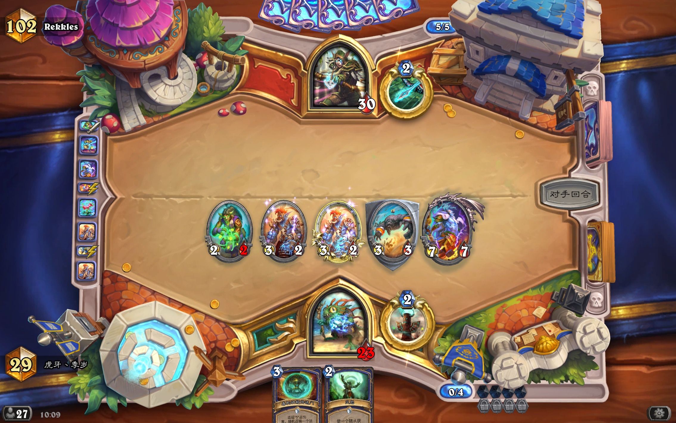 思路:打慢速德鲁伊是个很难打的对局,因为德鲁伊跳费后的场面不是我们能看得懂的,而且当我们处在过载状态下时,一个超凡之盟就可以让我们下回合空过。但是德鲁伊的弱点是解场不足,所以这个对局就是有啥怪就拍上去,能蹭多少是多少,后期希望德鲁伊没那么胡。一阶段奖励可以防住对面趁我们过载时超凡。