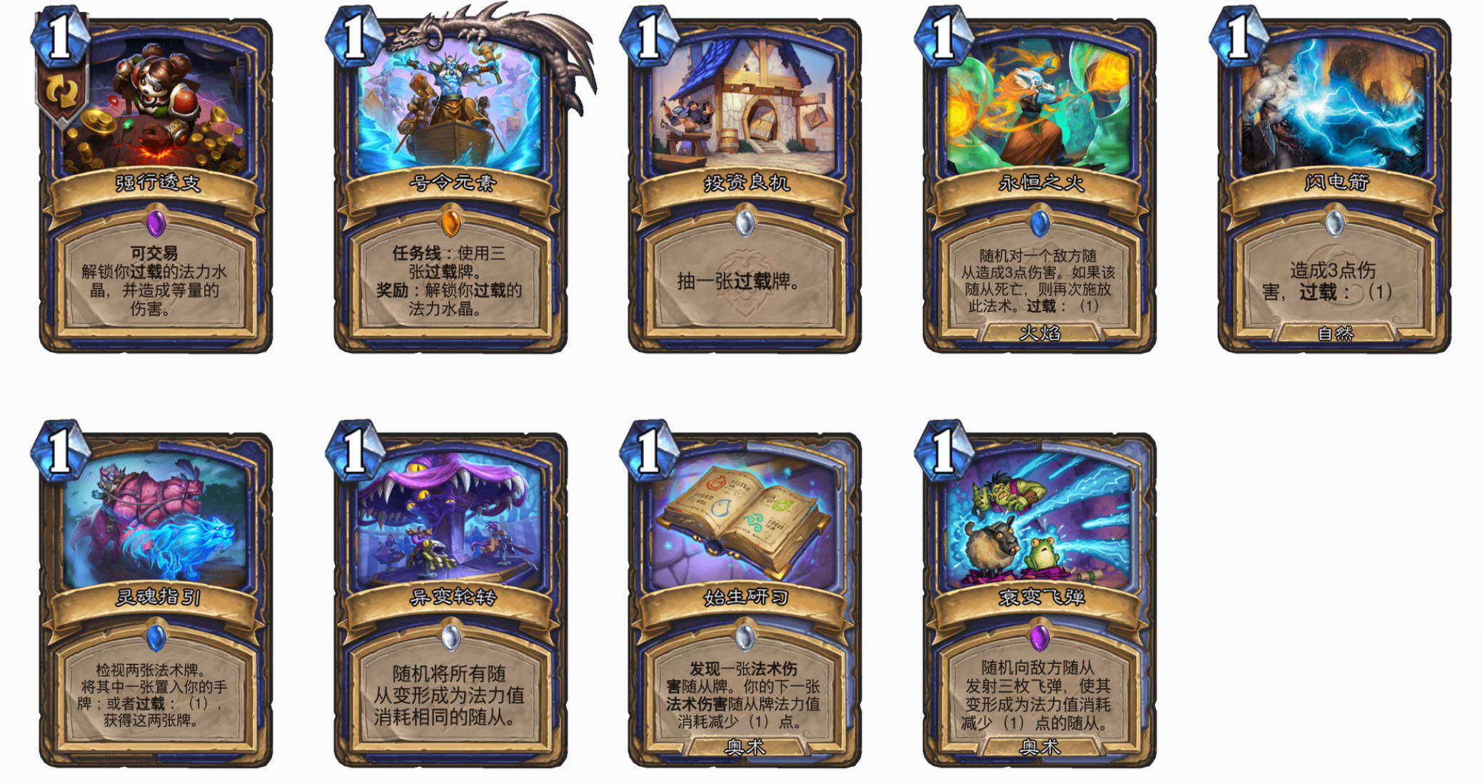 笔记能手:快打时可以收石化武器、风暴打击、闪电箭等直伤;慢打时可以选择收灵魂指引、闪电箭、毒蛇神殿传送门等过载牌做任务,也可以等任务完成后收质量牌;在面对中速术、一刀瞎等卡组时还可以选择收洪流解场。一般情况下不考虑收雷霆绽放,因为这样打笔记能手只相当于0费2/3的生物,我们不是靠铺场取胜的卡组,笔记收其它法术能发挥更大的作用,除非我们这回合非常急迫地需要完成任务。