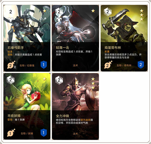 2法力:石像弓箭手*3,轻蔑一击*3(法术),捣蛋哥布林*3,丰收妖精*3,全力冲锋*3