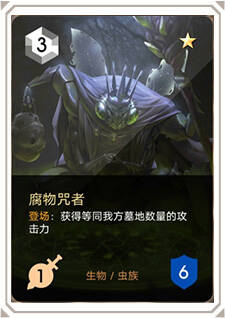 当我方墓地囤积高于敌方英雄的血量时,可通过召唤腐物咒者配合全力冲锋,一套拿下敌人直接获得胜利。注意:提前消耗掉敌方含有守护属性的生物牌。