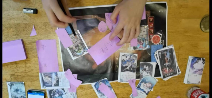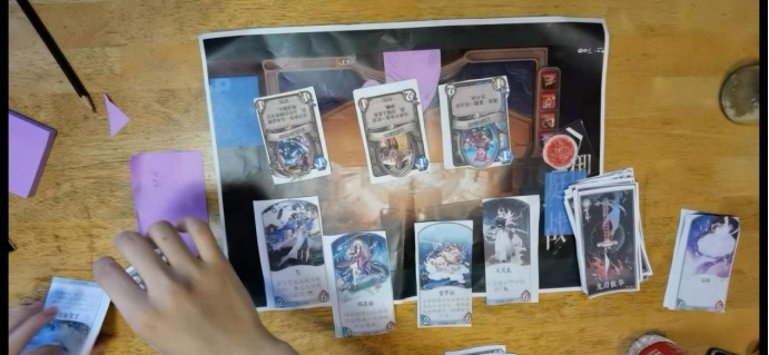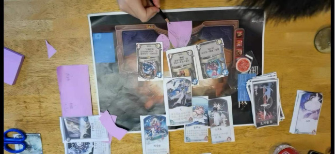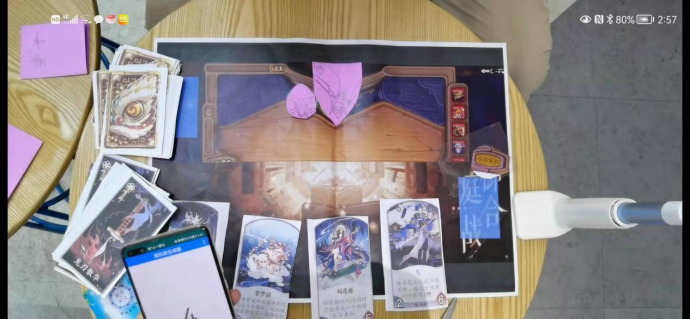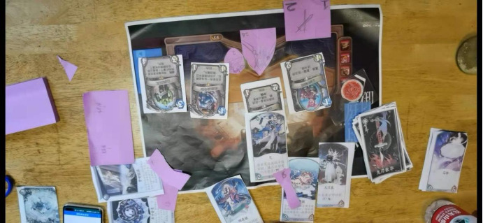 最左边两个牌库,中间的拼接场地,两方的随从和英雄,右边的正反两个回合结束按钮。最下面是我同学的手机用来生成随机数。然后最右边是用来照这张照片的手机支架。