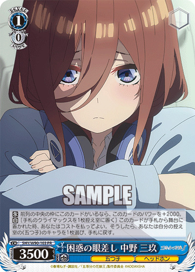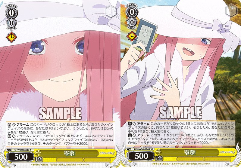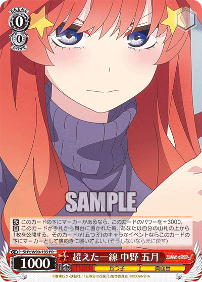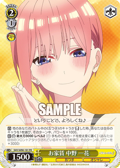 自:记忆 这张卡攻击时,己方的回忆在2张以上的话,这回合中,这张卡的战力+X。X等于己方的《五つ子》的角色的张数×1000。