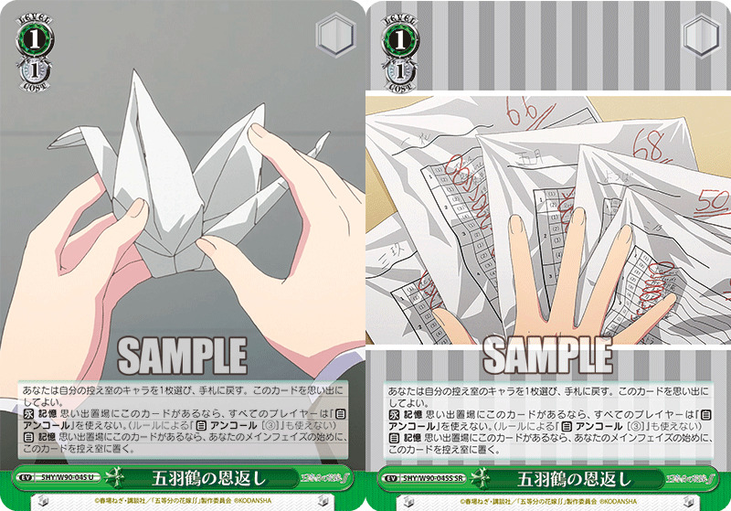 反击:你选择1张己方的战斗中的《五つ子》的角色变为回忆。下一个己方的抽卡阶段开始时,你将己方的回忆去的那个角色放置到舞台的任意位置。这回合中,那个角色的战力+1000,灵魂+1。