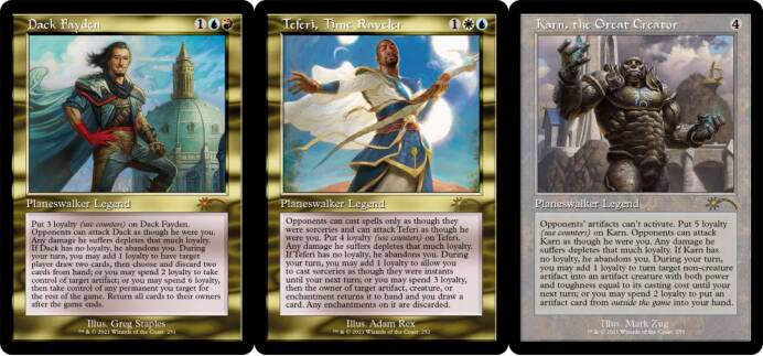 泰菲力的时间事故,卡恩、泰菲力和戴克费登,他们从30年前回来了,而且……好像连规则也是30年的写法。但不管处在哪个时间线,这三张传奇鹏洛客都是你牌组中最强力的组件。