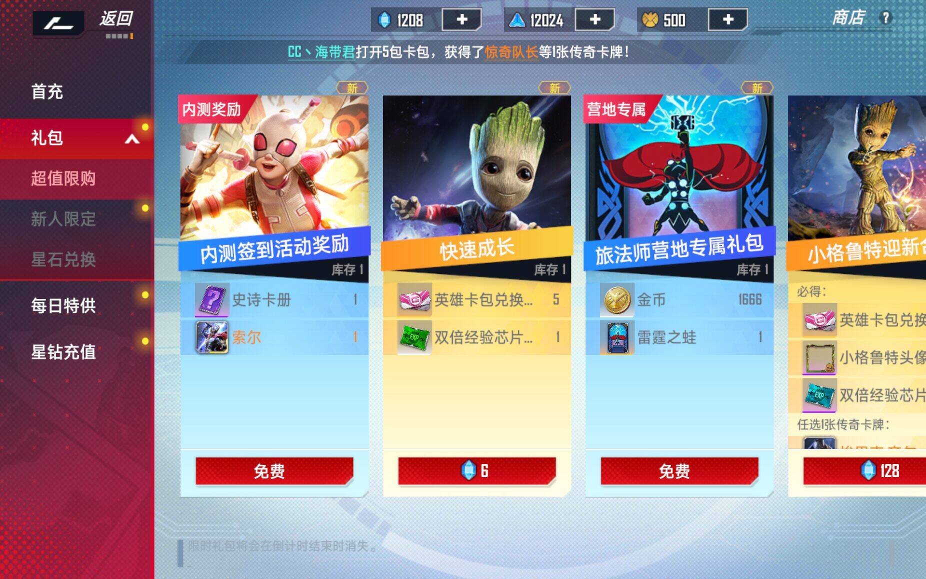 福利二:新人七日签到得自选橙卡;次日登录得美国队长皮肤