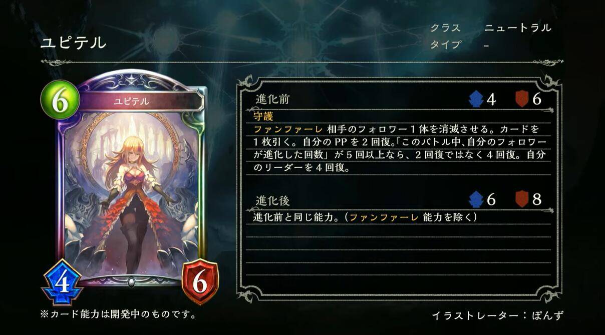 入场曲 令1个对方的随从消失,抽1张牌。回复自己的PP2点,如果“本局对战中自己的随从进化的次数”为5次或以上,则会改为回复自己的PP4点,并额外回复自己的主战者4点生命值。