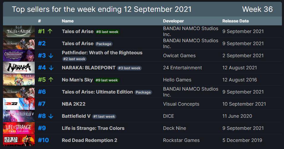 Steam公开新一周(9月6日-9月12日)销量排行榜,新发售的《破晓传说》不负众望,成功登顶销量榜,《开拓者:正义之怒》第三,《永劫无间》第四,《无人深空》第五。