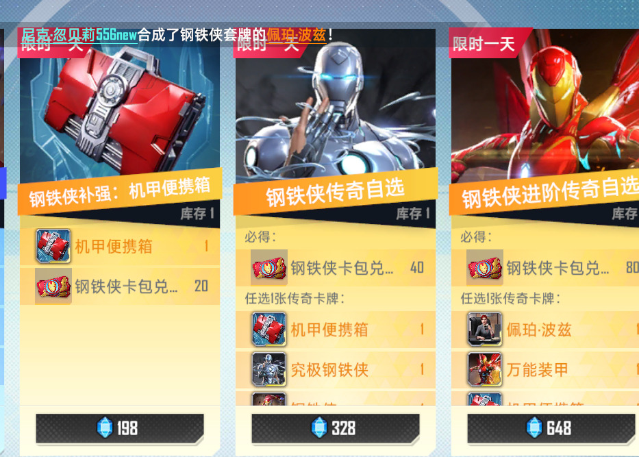 职业解锁礼包,一般大部分都是值得买的,除非是自己根本不想玩的英雄和性价比很低的,比如下图的”机甲便携箱礼包“就绝对不要买。职业解锁礼包只会出现一次,有时间限制的。以后如果回过头想买,对不起,没机会了,就像国际服现在你想收集一套【灭霸套娃流】,你花个几千元试试看能收集的够么?